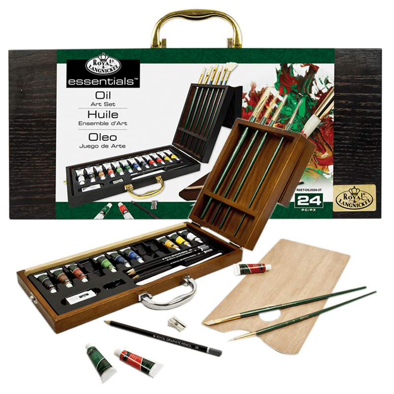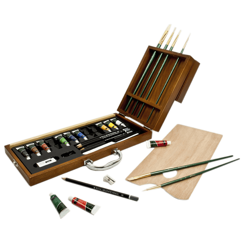 Prémiové sady od značky Royal & Langnickel sú podávané do odolných drevených boxoch. Box je dodávaný s ručne vyrábanými umeleckými materiálmi vysokej kvality, štetcami a nástrojmi, ako aj sprievodcom pri maľovaní s tipmi a technikami.