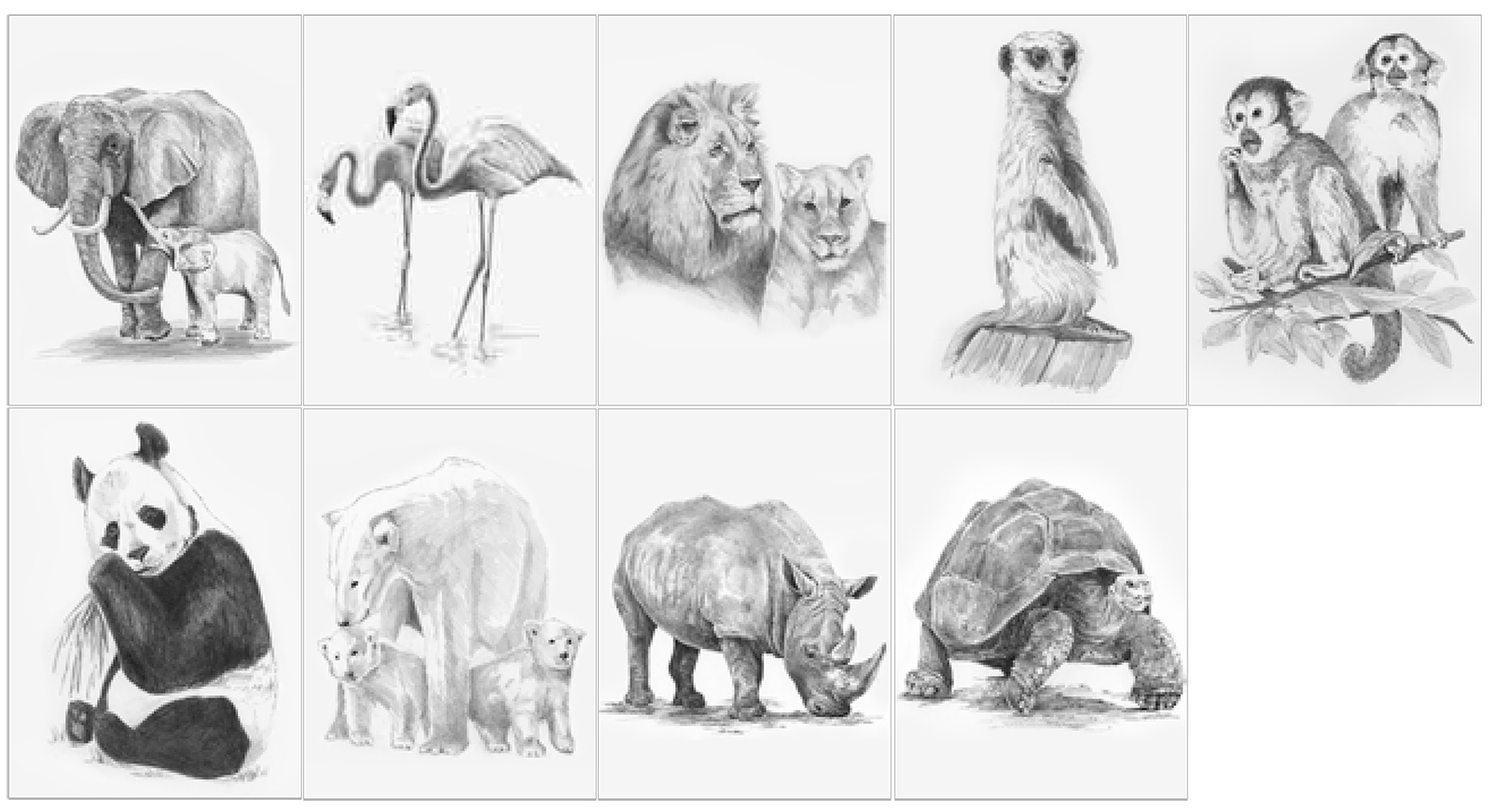 - 10 x obrázky na skicovanie s predznačeným motívom zoo zvierat (opice, levy, slony, panda, korytnačka, plameniak, polárne medvede, nosorožec)